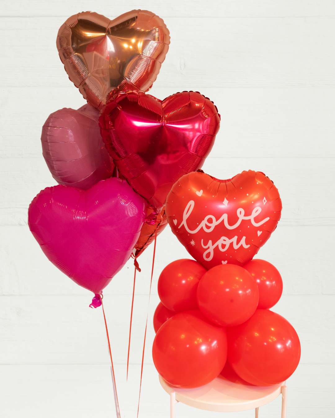 Beautiful balloons stacks for Valentine’s Day. Perfect gift for your better half. Our Love You air-filled 18" heart foil is beautifully placed on top of a red biodegradable latex balloon stack and 5 18" heart foil balloons.