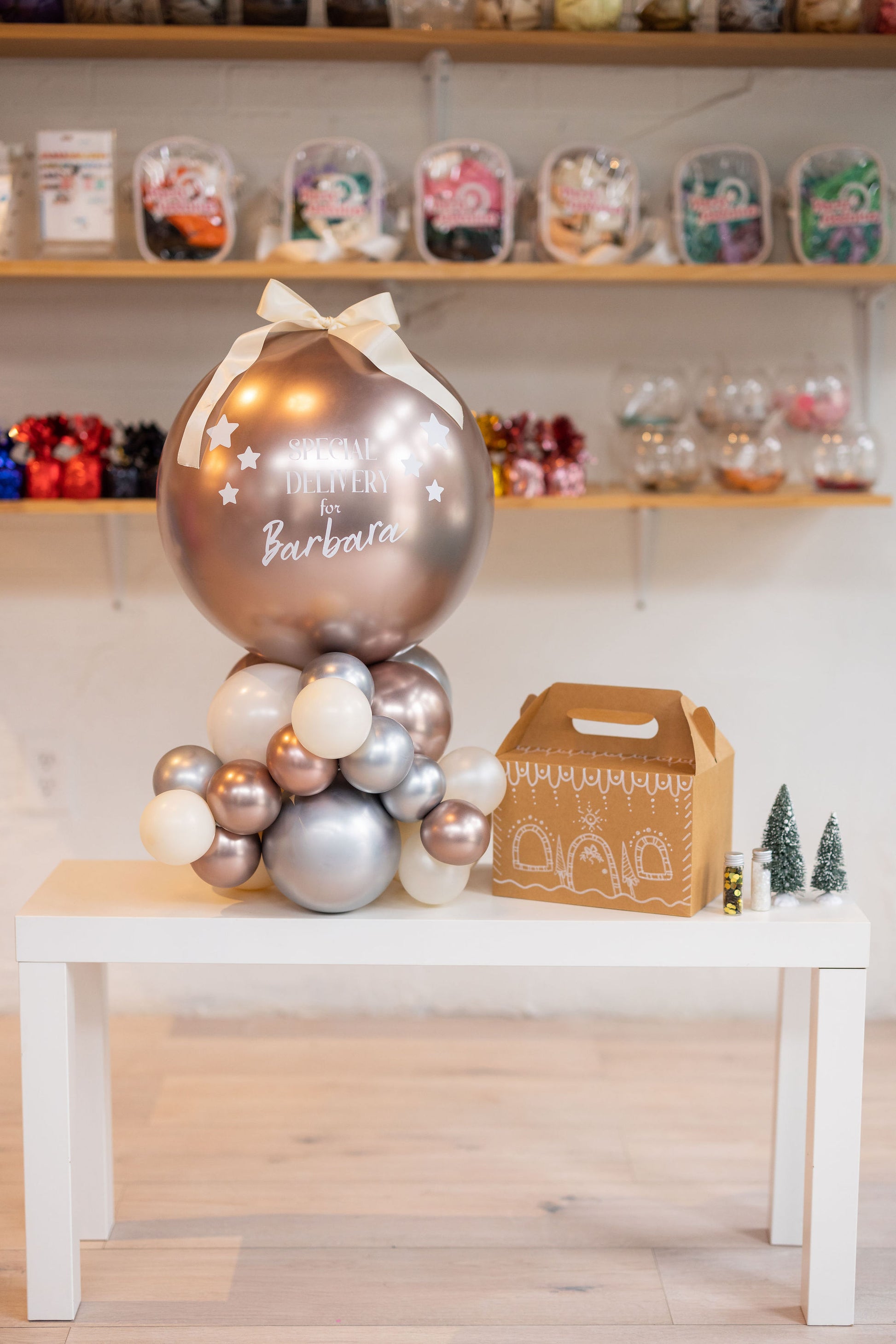 The show-stopping top balloon is perched on a clustered base of rich silver, cream, and rose gold biodegradable balloons. The Starry Night Holiday Friend Arrival offers a modern, elegant alternative to traditional red-and-green setups, instantly creating a stunning and memorable arrival scene.