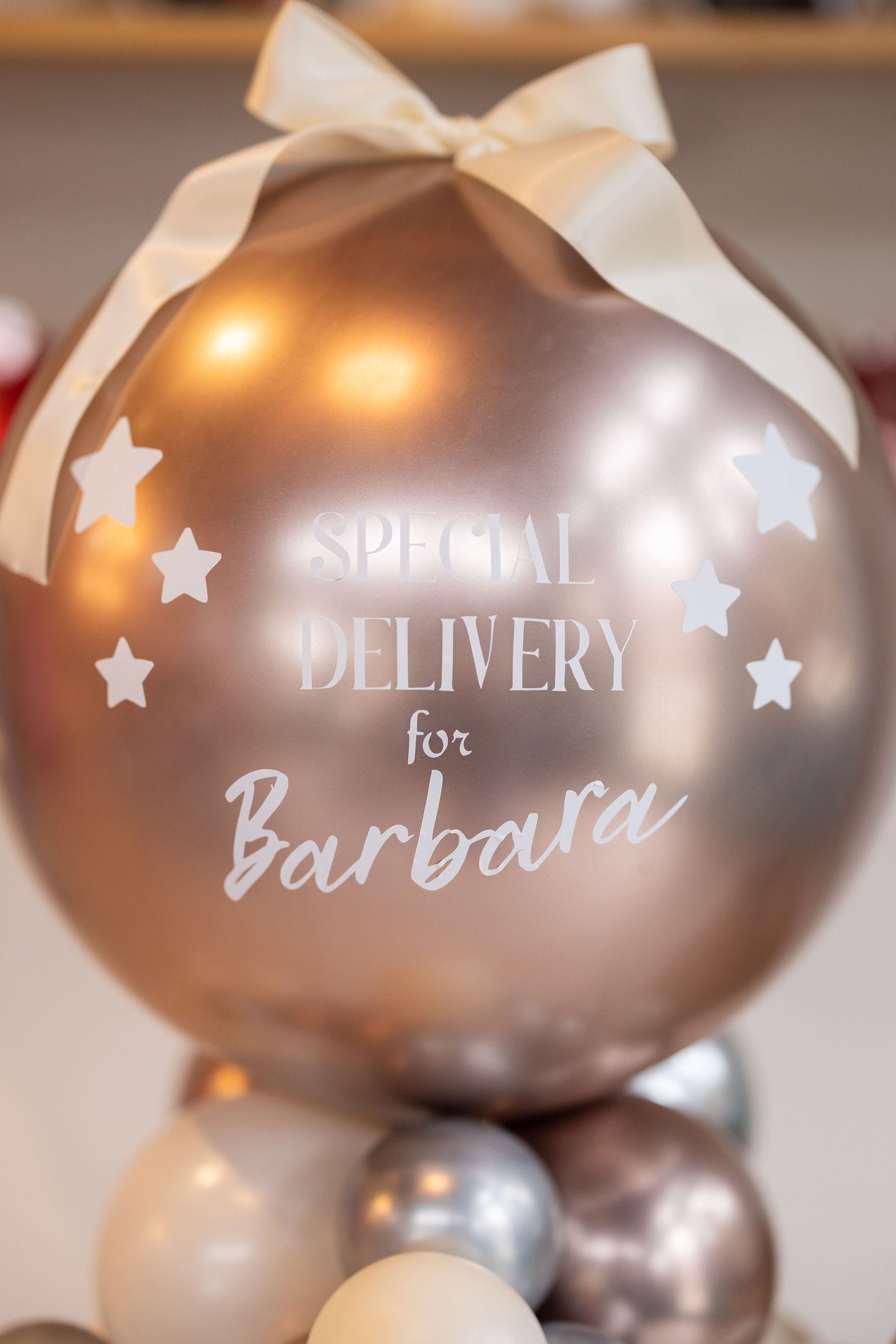 Introduce your holiday friend with unparalleled style using the Starry Night Holiday Elf Friend Arrival balloon stack. This sophisticated, air-inflated, and freestanding column features a beautiful Rose Gold and Shiny bobo balloon adorned with charming star decals and the essential "Special Delivery" message.